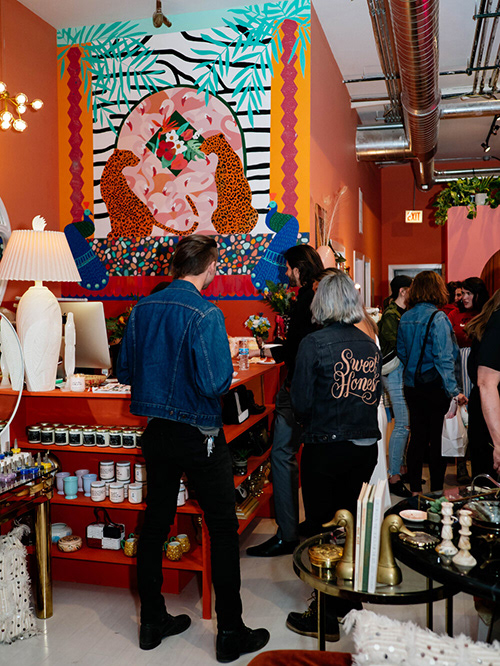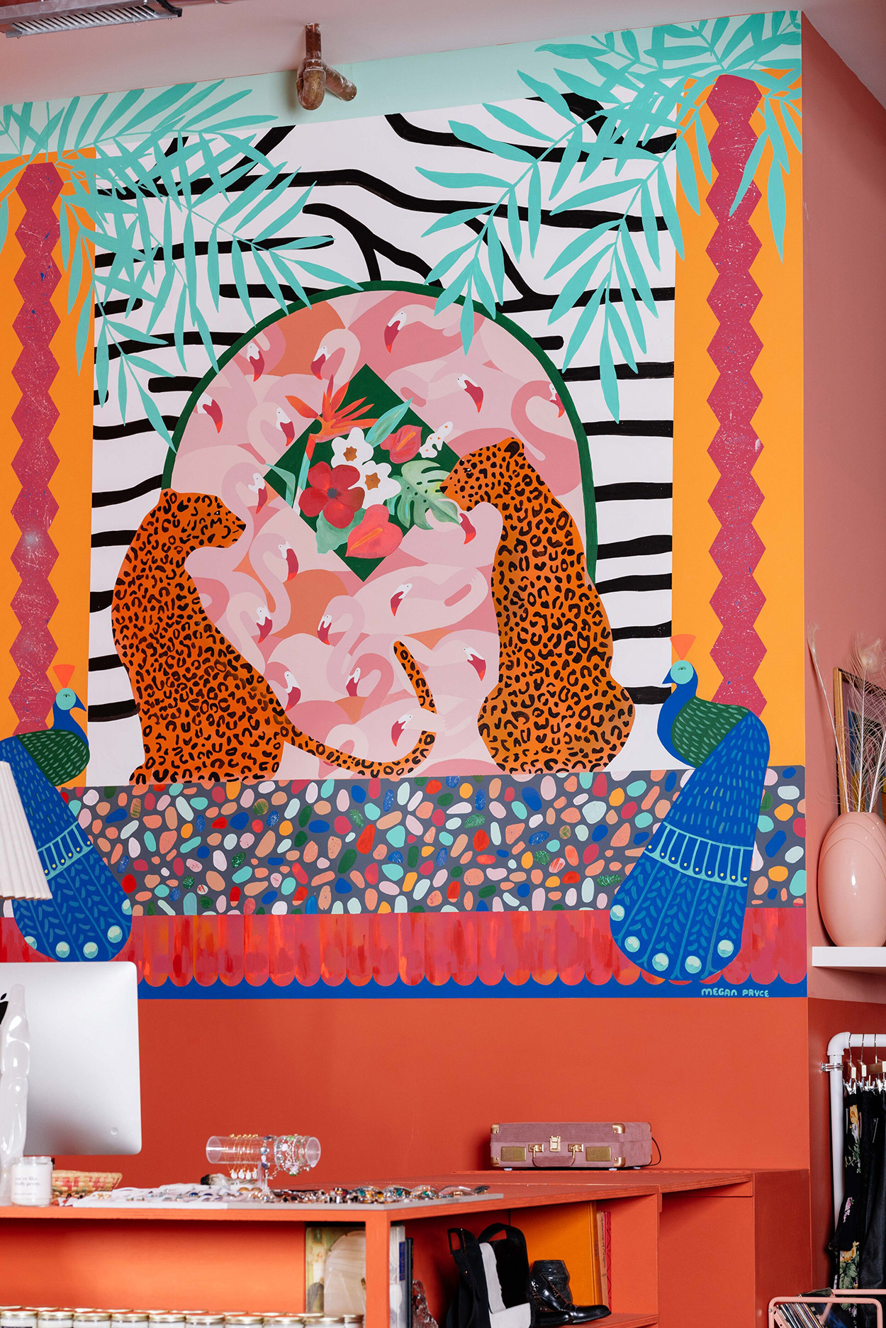 The owners of Lost Girls Vintage asked me to create a mural for their new location in Ukrainian Village that combined all of the funky style that they were striving for in the space. The interior was theme was Miami-chic with a touch of animal.